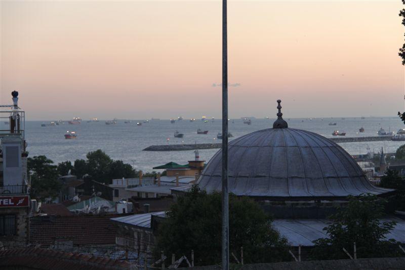 Unglaubliche Strassen nach der Grenze. Wahnsinn. 2 Spuren in jede Richtung, feinster Belag, endlose Radien, kein Verkehr. Also volles Rohr. Das Land fliegt an uns vorbei. Grün, schön, weit, sauber. Durst. Also stoppen wir in Kirklareli und kippen Tee und Cola. Wir sind in der Türkei. Istanbul liegt in greifbarer Nähe. Also weiter. Und dann wird der Verkehr dicht. Ganz dicht. Wirklich ganz dicht. Istanbul hat an die 15 Mio. Einwohner. Und ein Teil davon fährt immer mit dem Auto. Und mittendrin 3 Motorradfahrer mit ausländischem Kennzeichen. Und dann sollst du auch noch dem ersten Motorrad folgen, aber deinen Hintermann nicht verlieren. Wie machst du das, wenn selbst in eine 5 m Lücke plötzlich ein Bus oder LKW dazwischen paßt. Irr. Da hatten wir echt zu kämpfen. Aber irgendwie ist es doch gegangen. Nach vielen Staus und durchschwitzter Kleidung, erreichen wir unser Hotel. Klein aber fein in der Nähe der Altstadt. Leider auch in der Nähe einer Moschee. Da gibt es kein Bier. Auch nicht außerhalb des Ramadan. Aber es wäre nicht die Türkei, wenn es nicht doch eine Lösung gäbe. Also wird ein Boy losgeschickt und kurz darauf stehen 3 kalte Bier vor uns. Sehr angenehm, dieses Istanbul. Und erst die Aussicht von der Dachterrasse. Freier Blick auf die Moschee und die wartenden Schiffe vor der Einfahrt in den Bosporus. Unglaublich schön. Unglaublich auch, daß wir nach 6 Tagen Fahrt den Orient erreicht haben. Auch wenn wir jetzt noch auf der europäischen Seite der Türkei sind. Dann läutet das Telefon. Henry ist gut gelandet und spätestens in einer Stunde im Hotel. Abendessen zu viert steht jetzt am Plan. Schön.